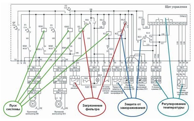 Une des options de connexion, où NK1 et NK2 sont des appareils de chauffage de type canal ; M1 - ventilateur triphasé ; A, B, C - connexion réseau, N - neutre, PE - terre ; Q - thermostat de protection contre la surchauffe ; Y - thermostat de protection contre l'allumage