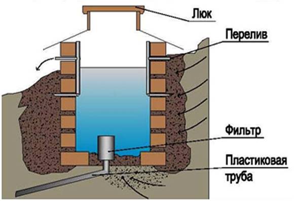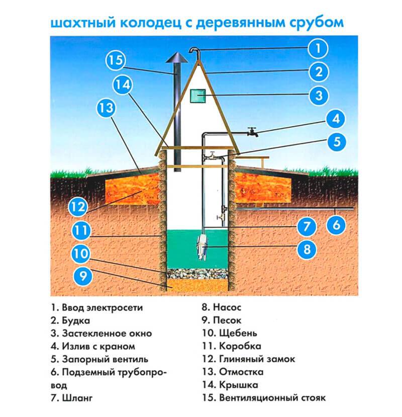 Un puits domestique simple sous l'eau a un schéma standard. Le niveau inférieur de la structure du puits est une prise d'eau, puis se trouve le tronc, qui passe dans la tête - la partie hors sol.