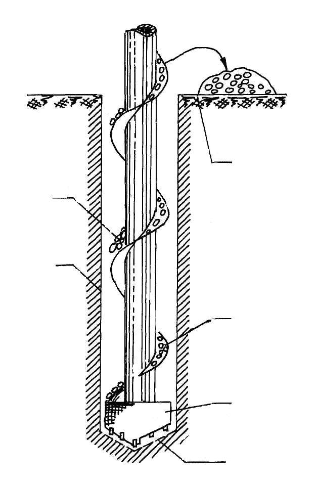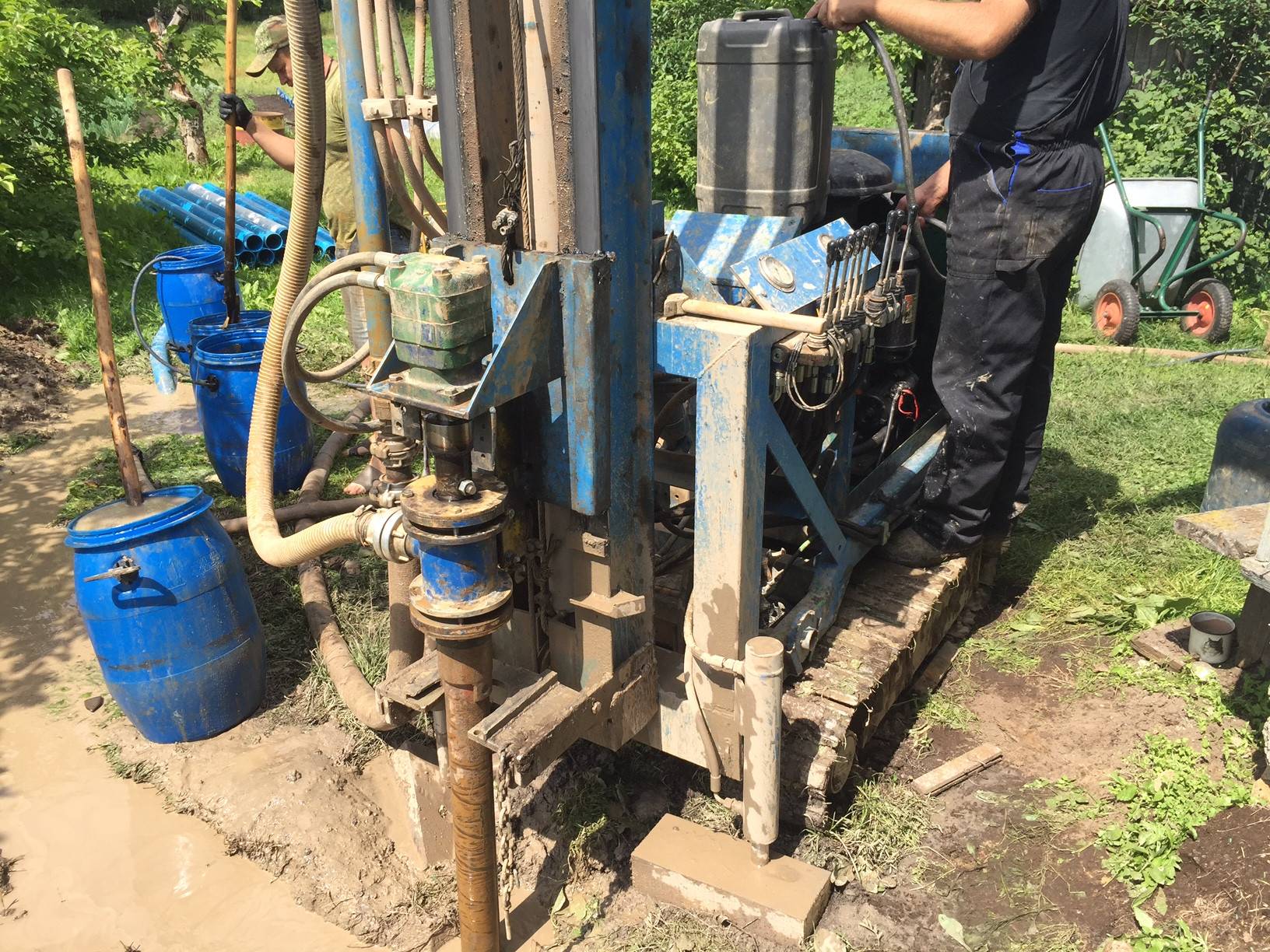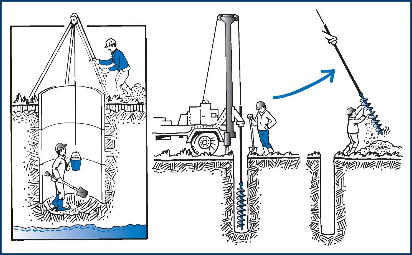 Grâce à la technologie de forage à la tarière, il est possible de creuser un puits jusqu'à 100 mètres de profondeur. Il est difficile de le faire manuellement, par conséquent, des installations électriques fixes sont utilisées et la foreuse est construite avec de nouvelles sections à mesure qu'elle s'approfondit. Périodiquement, il est soulevé pour déverser le sol. Pour éviter que les murs ne s'effondrent, un tube de tubage est posé après le forage.
