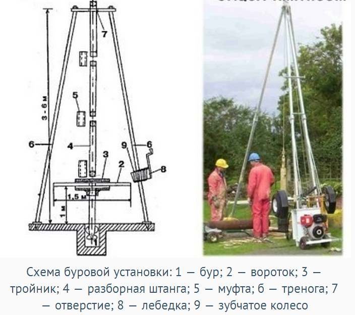 La tour et le treuil assurent le levage de la foreuse et sa descente avec les tiges (drill string). Ici, vous pouvez également utiliser un trépied comme tour. Les tuyaux sont reliés les uns aux autres - ils forment des tiges de forage; la perceuse est attachée au fond. Lors de l'utilisation d'une perceuse à cuillère, le boîtier est installé dans le processus; un tel foret le traverse librement. Lors de l'utilisation d'un foret hélicoïdal, il est périodiquement retiré et libéré du sol, en démontant le train de tiges, puis en le remontant. L'occupation n'est pas facile, mais il est possible de traverser des couches d'argile ou de gravier uniquement avec un foret en spirale ("cuillère" ne prendra pas de gravier).