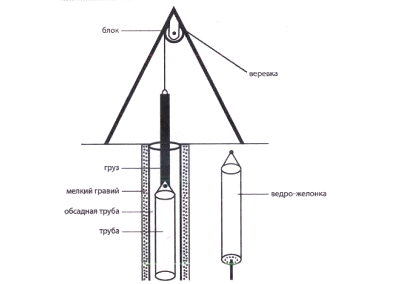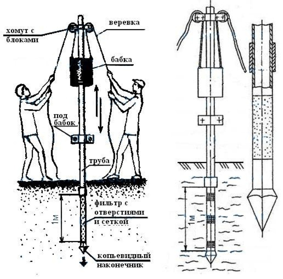 L'appareil doit être périodiquement soulevé et déversé hors de la terre du tuyau. Plus le tuyau est profond, plus il est difficile de le soulever. De plus, le défilement nécessite l'utilisation de la force brute. Le plus souvent, plusieurs personnes travaillent. Pour faciliter le forage du sol, il est lavé à l'eau, en le versant d'en haut dans le tuyau à l'aide d'un tuyau et d'une pompe.