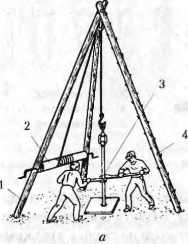 L'installation est simple - un trépied avec un verre conducteur; la vitre est reliée par un câble au treuil. Le verre est soulevé avec un treuil, puis relâché : le projectile coupe le sol avec une arête vive. Le verre est retiré, le sol en est retiré et le processus se poursuit. Si le sol est meuble, on utilise une écope (un simple verre ne convient pas dans ce cas, car il perd tout ce qui est ramassé en chemin) avec un amortisseur dans la partie inférieure, qui se ferme lorsque le projectile est rempli.Sur les sols caillouteux, il faut d'abord travailler avec un ciseau, puis avec une écope pour extraire la roche concassée, mais il est plus opportun d'utiliser une autre méthode.