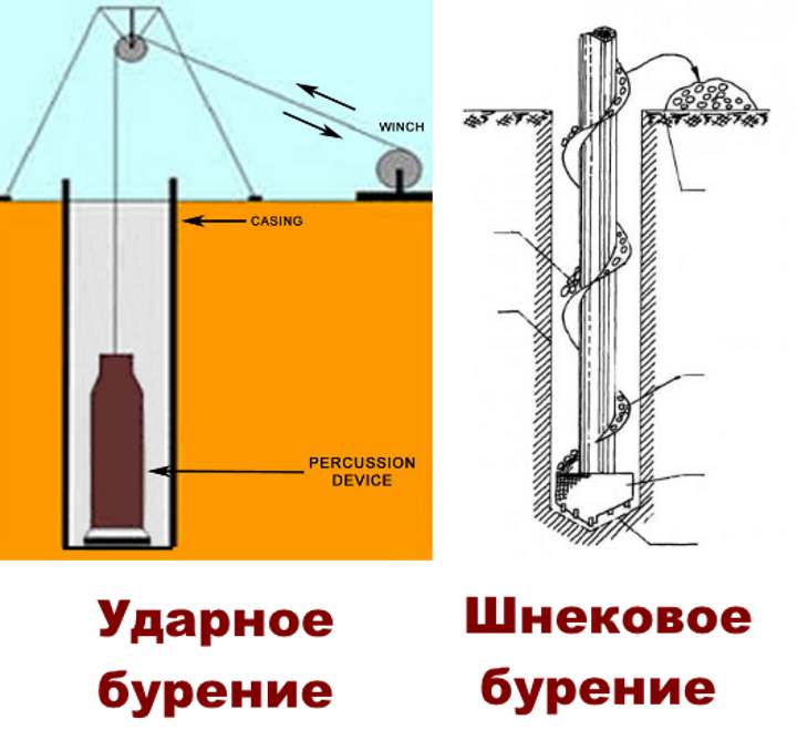 Le forage à percussion est la méthode la plus ancienne encore utilisée aujourd'hui. Le principe est de descendre la coupelle métallique dans le tubage et d'approfondir progressivement le puits. Pour le forage, vous avez besoin d'un cadre avec un câble fixe. La méthode nécessite du temps et un soulèvement fréquent du tuyau de travail pour verser le sol. Pour faciliter le travail, utilisez un boyau avec de l'eau pour éroder le sol.