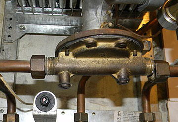 - Débranchez les tuyaux d'entrée et de sortie d'eau vers l'échangeur de chaleur. Si l'échangeur de chaleur n'est pas nettoyé régulièrement, les écrous de fixation peuvent être obstrués par du tartre, les empêchant de se détacher. Dans ce cas, nous vous recommandons d'utiliser un liquide spécial VD-40, qui peut être acheté chez n'importe quel concessionnaire automobile. Il est nécessaire de faire couler du liquide dans les jonctions des écrous à l'aide d'un huileur. Vous pouvez également utiliser "Silit" à partir de l'échelle. Après 15-30 minutes, les écrous peuvent être dévissés. Si cela ne fonctionne pas, essayez de tapoter l'écrou de tous les côtés.