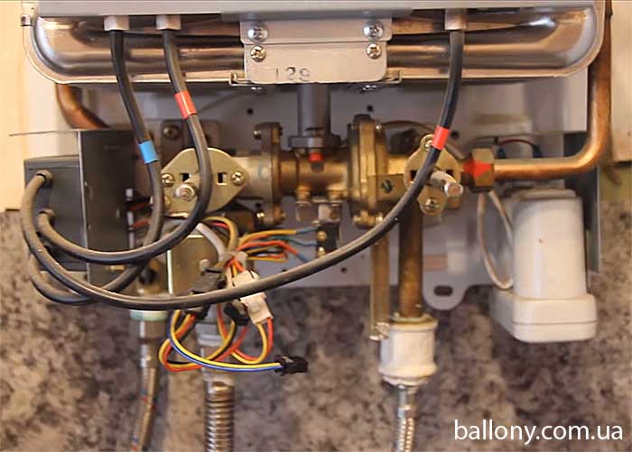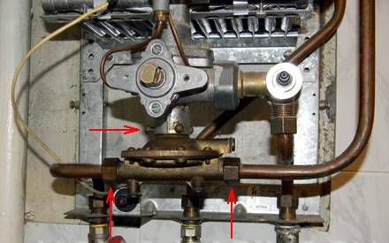 Un joint est installé à cet endroit (entre le brûleur et le bloc gaz). Attention - la sécurité du geyser est assurée par l'étanchéité de cet appareil