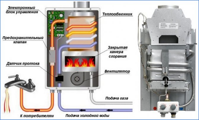 Tout chauffe-eau moderne se compose d'une boîte rectangulaire et d'une alimentation en gaz et en eau. L'eau froide pénètre dans l'appareil et traverse le compartiment du radiateur, où elle est chauffée à l'aide d'un brûleur spécial.
