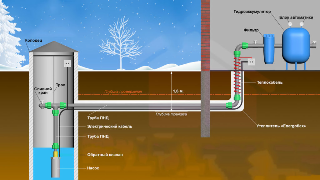 Pour forer un puits une somme d'argent décente est nécessaire et son entretien est encore plus cher, respectivement, la plomberie d'hiver à partir d'un puits est un moyen rentable d'obtenir de l'eau chaude.