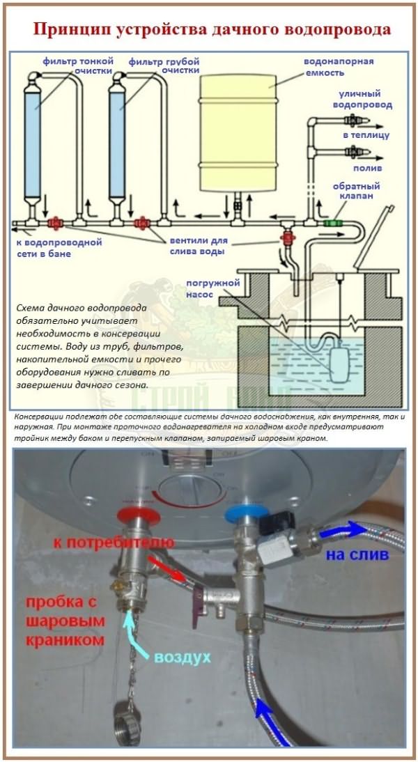Il y a deux options : au-dessus et au-dessous du sol. Dans les deux cas, l'eau est bloquée dans la maison ou au point de raccordement au réseau, et ce qui reste dans le système doit être vidangé.