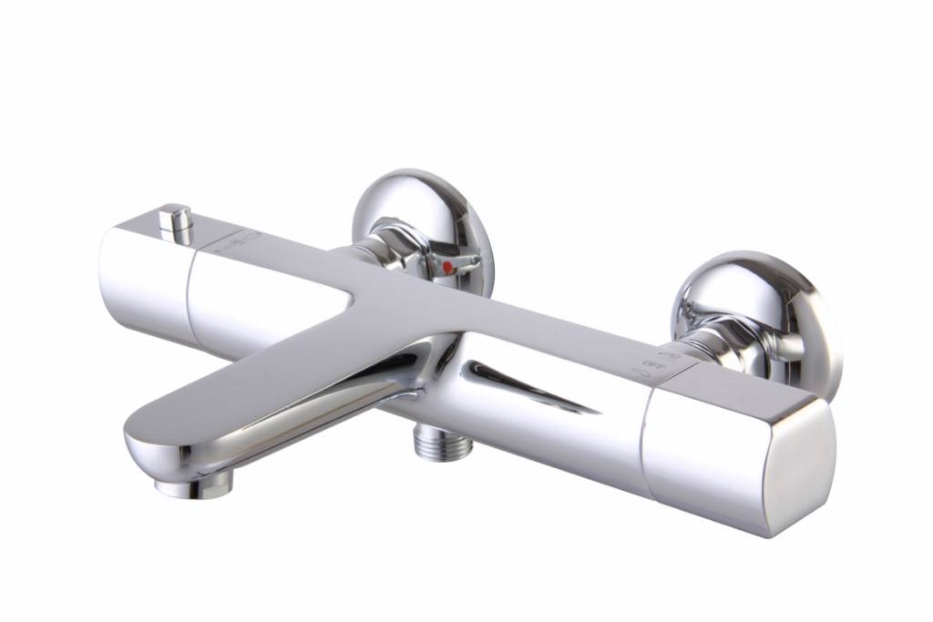 - Robinet de bain avec thermostat. Cette version de l'élément pour la plomberie est standard. Il a un bec verseur, ainsi qu'une pomme de douche, qui est équipée d'un interrupteur. La forme d'un tel mélangeur peut être variée. Cependant, la plupart des options sont réalisées sous la forme d'une structure tubulaire. Les commutateurs sont situés le long de ses bords. Les robinets de salle de bain peuvent être à la fois muraux et intégrés sur le côté de la salle de bain.