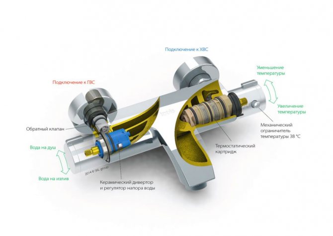 Il semblera étrange à beaucoup qu'un tel équipement de plomberie moderne ait en fait une conception extrêmement simple. Tous les échantillons ont une vanne de mélange spéciale, dont le fonctionnement est contrôlé par la cartouche. Il est le plus souvent fabriqué à partir de plaques bimétalliques ou contient de la cire dans sa composition et est très sensible aux changements même minimes de la température de l'eau.