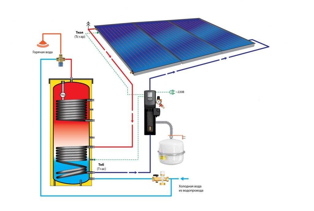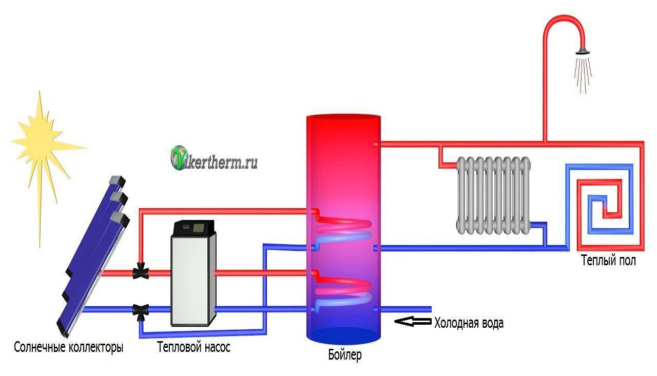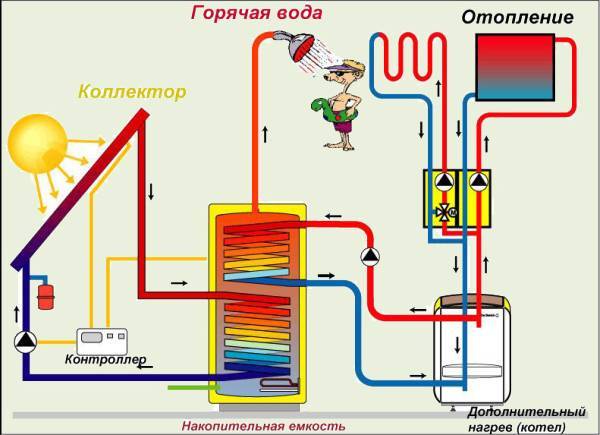 Le schéma "correct" pour connecter un capteur solaire sous vide au système de chauffage. La chaleur n'est pas transférée directement, mais via un échangeur de chaleur, l'excès de chaleur diurne est stocké dans un accumulateur de chaleur (réservoir tampon) pour la nuit