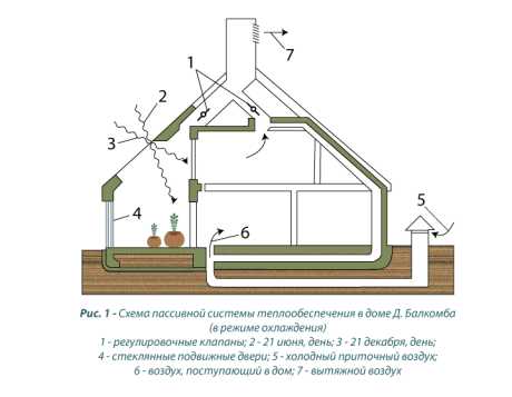 Chauffage solaire de l'air basé sur un capteur solaire. Du panneau creux (1) à travers les canaux d'air (6), le ventilateur entraîne l'air dans le local technique, où l'automatisation, selon la situation, le distribue à l'unité de préparation d'air (3) ou à un accumulateur de chaleur massif ( 2). Dans le même temps, la batterie à eau chaude (5) peut également chauffer. Pendant la journée, lorsque les pièces ont besoin de chauffage, le système fonctionne en mode B, l'air chaud du collecteur est envoyé dans les pièces. Lorsque la température requise dans la maison est atteinte, le flux d'air est redirigé vers l'accumulateur de chaleur, mode A. La nuit, lorsque le collecteur ne fournit pas de chaleur, le registre ferme le canal qui y mène, la circulation s'effectue entre la chaleur accumulateur et les locaux.