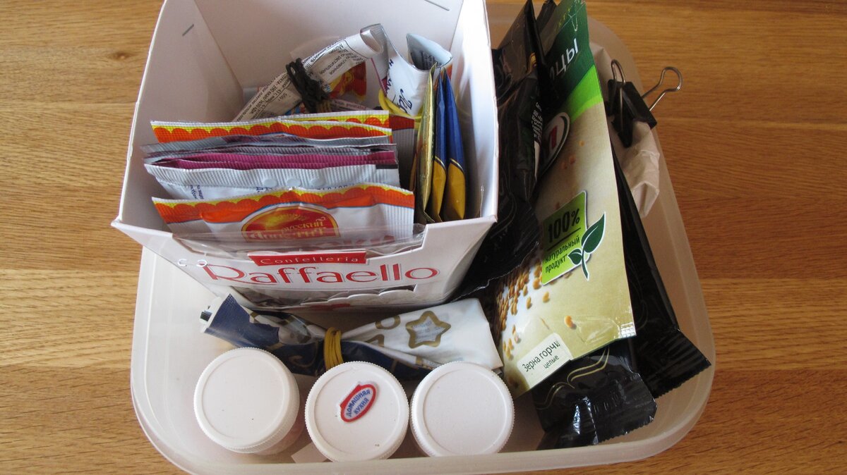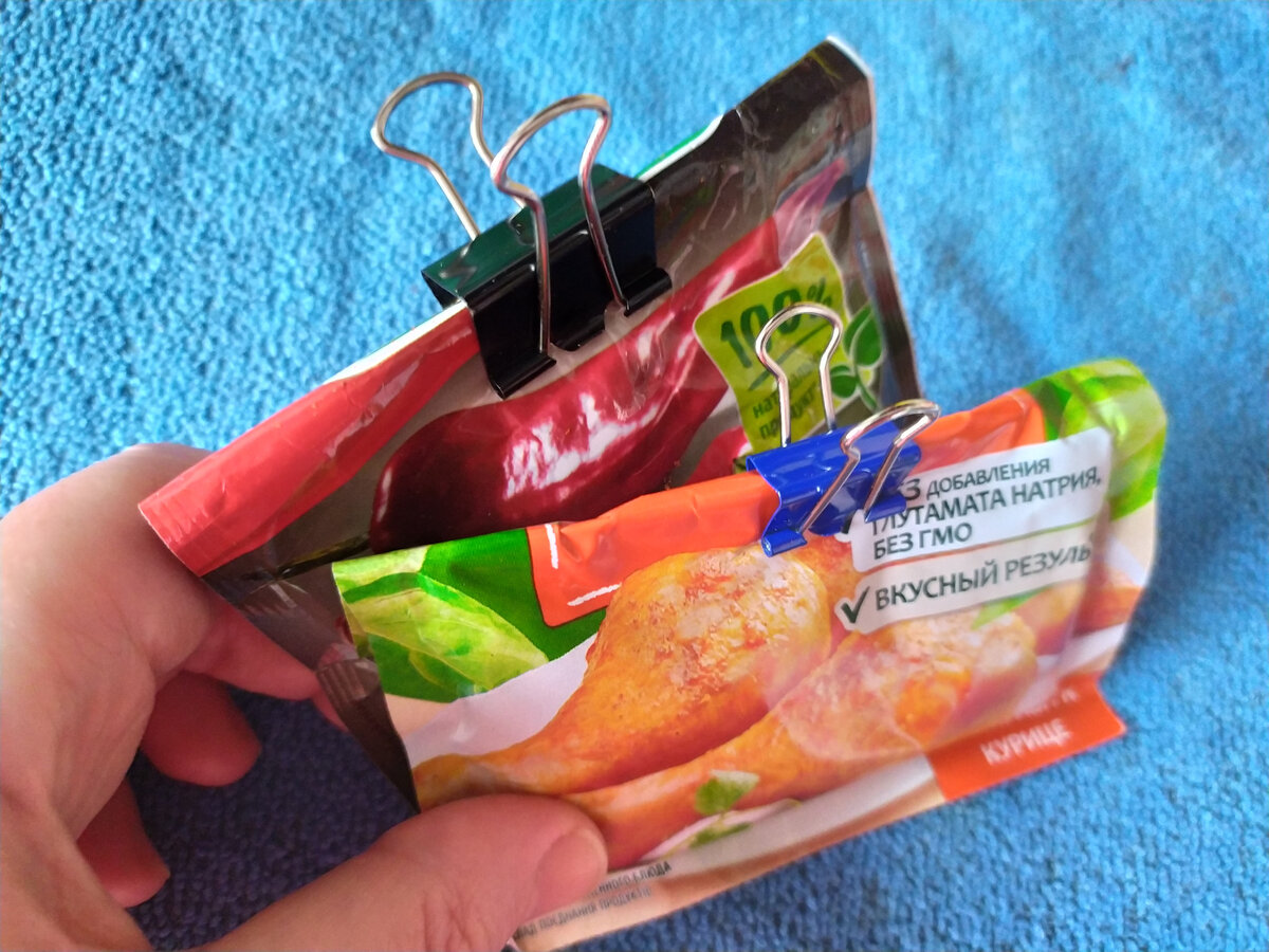 Des clips utiles étaient dans la cuisine. Il est très pratique de les fermer avec des paquets d'épices déjà entamés. Bien sûr, ils peuvent être dispersés dans des bocaux, mais où en trouver autant et où les mettre. Personnellement, j'ai résolu le problème comme ça, comme sur la photo!