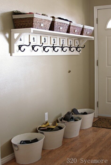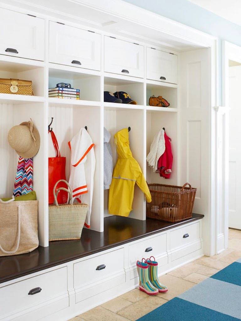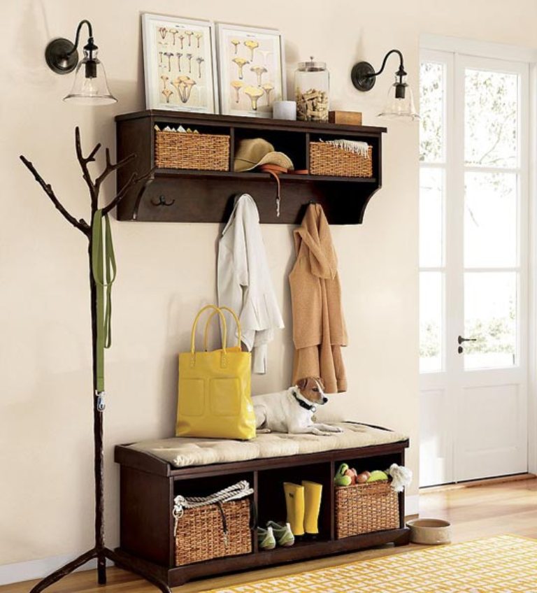 Lorsqu'il n'y a pas assez d'espace horizontal, vous devez tirer le meilleur parti de l'espace vertical. Dans ce cas, les crochets les plus ordinaires viendront à la rescousse. Plus il y en a, mieux c'est. Les crochets inférieurs seront utiles pour les sacs, les clés et les parapluies, les cintres au niveau des yeux aideront à ranger les vêtements et la rangée supérieure sera réservée aux casquettes et chapeaux.