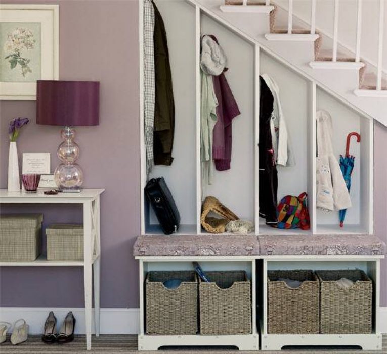 - Il est intéressant de battre un petit espace d'entrée dans la maison où se trouvent les escaliers. Outre le fait qu'un dressing peut être placé en dessous, des étagères ou un espace séparé pour les vêtements pour adultes et enfants sont souvent montés dans les escaliers eux-mêmes. Parfois, la conception de la pièce implique le placement de niches de stockage directement sur les marches elles-mêmes en présence d'un large escalier.