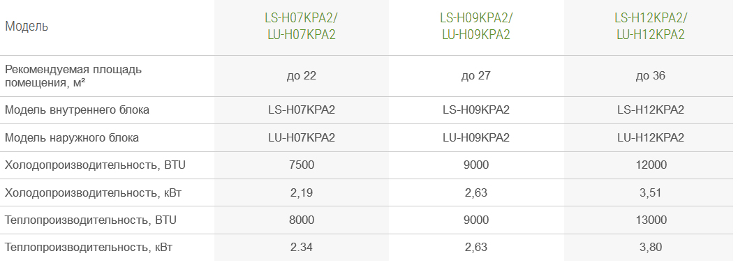Les systèmes divisés et d'autres types d'unités de refroidissement sont disponibles sous la forme de gammes de modèles avec des produits de performances standard - 2,1, 2,6, 3,5 kW, etc. Certains fabricants indiquent la puissance des modèles en milliers d'unités thermiques britanniques (kBTU) - 07, 09, 12, 18, etc. La correspondance des unités de climatisation exprimée en kilowatts et BTU est indiquée dans le tableau.
