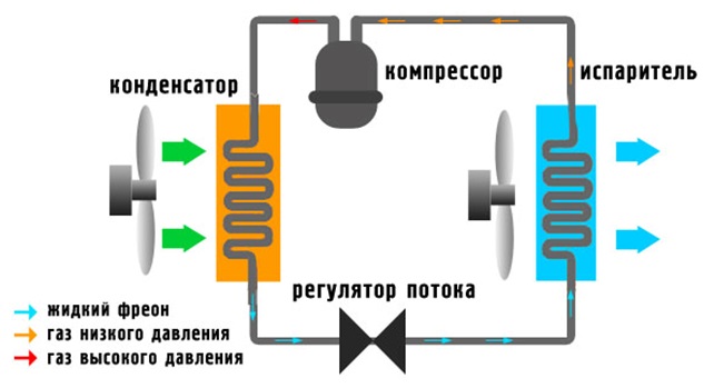 Le fonctionnement de ce schéma repose sur la propriété des liquides qui peuvent absorber de la chaleur lors de l'évaporation, mais lors de la condensation, au contraire, la libérer. L'agent des systèmes de réfrigération est le fréon, qui circule dans le circuit.