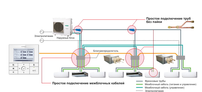 Les deux autres parties sont situées dans les unités intérieures et sont constituées d'évaporateurs et de tubes capillaires. Tous les participants au système sont reliés les uns aux autres par des lignes de fréon.