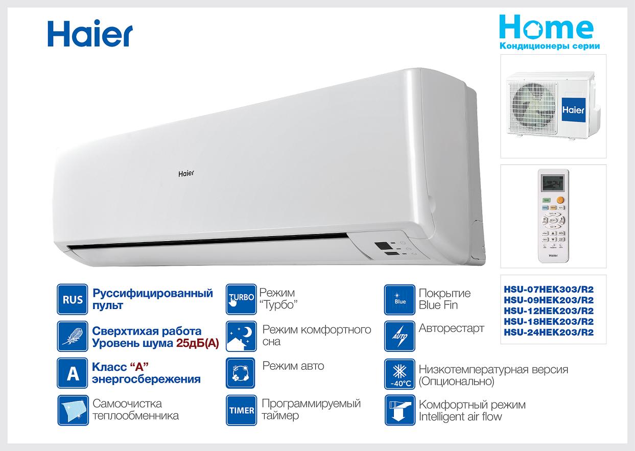 - Haier HSU-07HMD 303/R2 est un climatiseur silencieux avec un filtre anti-allergique. Peut-être la combinaison la plus réussie de prix et de qualité, avec un design élégant et moderne de l'unité intérieure (bon plastique, écran, support mural pour la télécommande).