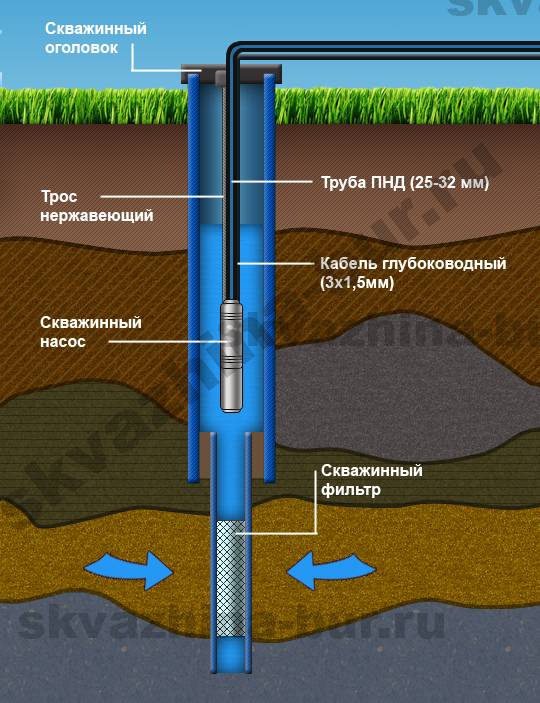 - Un développement à double enveloppe - un tuyau perforé est monté dans la partie inférieure de la colonne dans l'aquifère et une pompe y est placée, l'autre moitié est installée sur le dessus, atteignant la couche de calcaire. À travers les trous de la biellette inférieure, l'eau pénètre dans le tuyau et est pompée à l'embouchure avec une pompe. Utilisé lorsque la pression du réservoir est faible.