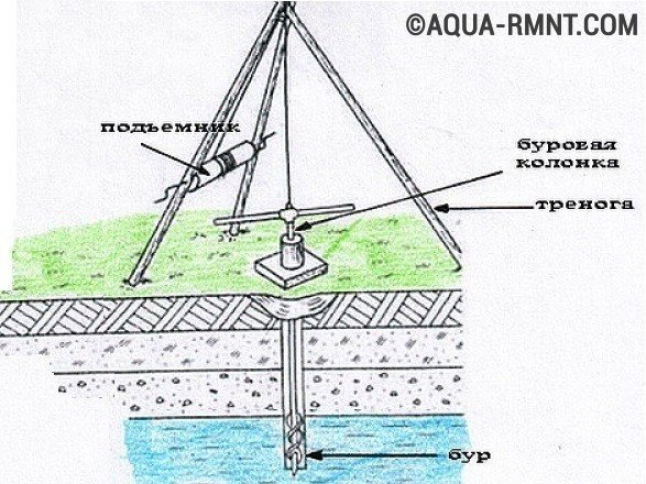 Lors du forage de puits artésiens, les appareils de forage sont utilisés par des professionnels. Pour les petits puits, un trépied conventionnel avec un treuil convient. Il abaissera et élèvera l'outil de forage, composé d'un carottier, de tiges de forage, d'un noyau pour le forage, d'une perceuse.