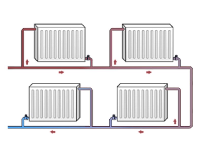 Le système de chauffage à deux tuyaux gagne du terrain en toute confiance. Les radiateurs relient les conduites de retour et d'alimentation. Des anneaux locaux se forment entre les batteries et la source de chaleur.