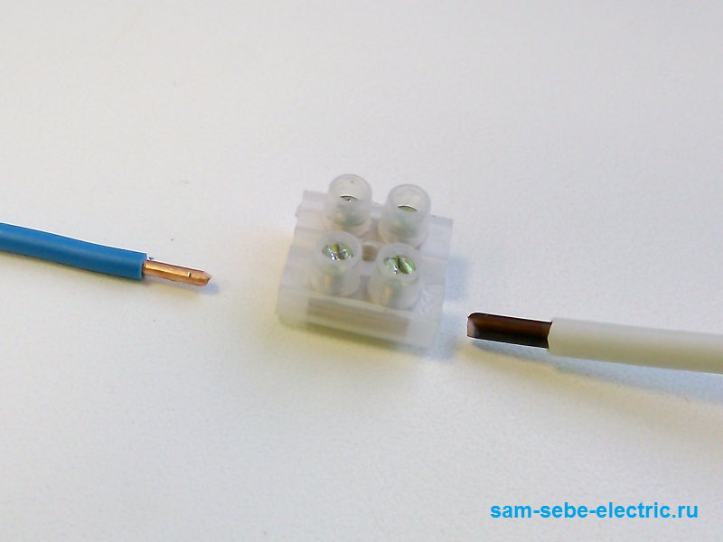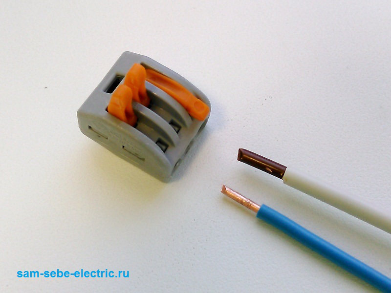 Actuellement, les fils sont de plus en plus connectés avec des pinces à ressort terminales. Dans ce cas, vous n'avez rien à tordre ou à souder, il vous suffit de dénuder les extrémités des fils d'environ 12 mm et de les insérer dans les trous de serrage.