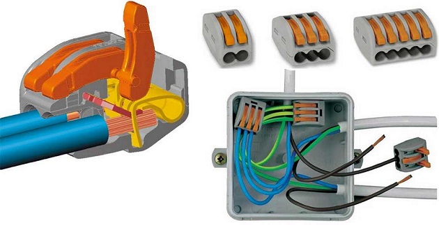 Le plus souvent, il y a des entreprises Vago. Pour connecter les câbles de cette manière, il suffit de dénuder les câbles à la longueur souhaitée et de les insérer dans un connecteur de bornier spécial. La plaque métallique à l'intérieur du mécanisme appuiera sur le câble, le fixant ainsi solidement.