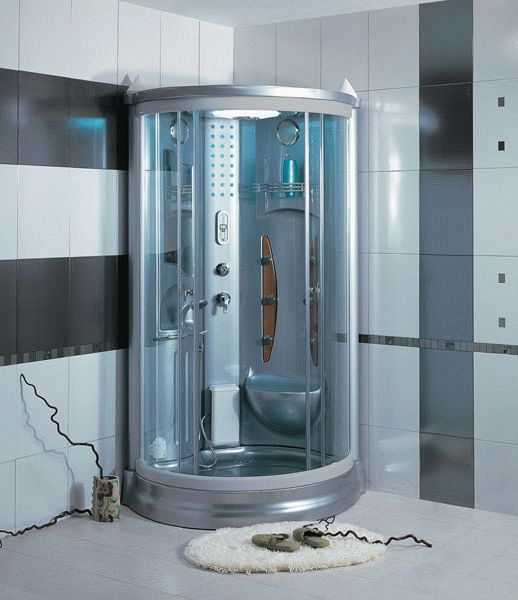 Soit dit en passant, les buses peuvent être montées à différents niveaux, ce qui permettra à chaque membre de la famille, y compris les plus petits, de profiter régulièrement d'un tel hydromassage.La douce pression de l'eau qui coule de la douche au plafond créera l'effet d'une pluie d'été et aidera à calmer les nerfs surexcités. Certains modèles sont équipés de générateurs de vapeur, ce qui vous permet de simuler le microclimat d'un bain à l'intérieur de la cabine de douche.