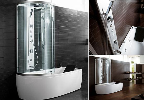 Les structures combinées, ou cabines de douche, sont équipées de baignoires au lieu d'une palette, et les parois sont fixées le long du bord des côtés de la cuvette. Ils sont fabriqués à la fois en version ouverte et fermée, selon le modèle. Ici tous les avantages des cabines et des baignoires sont réunis, par exemple, vous pouvez installer une douche cascade ou une douche Charcot en même temps qu'un jacuzzi.Les inconvénients du design : prix élevé et dimensions importantes (par rapport à une cabine classique).
