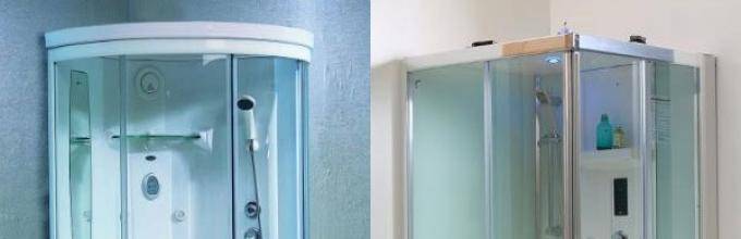 La conception de la cabine et du coin est différente. Cependant, les matériaux utilisés sont les mêmes. Les portes nécessitent du verre trempé. Son épaisseur peut être de 4, 6 et 7-8 mm. Plus souvent que d'autres, ils prennent du verre de 6 mm. La durée de vie de ces portes atteint 30 ans.