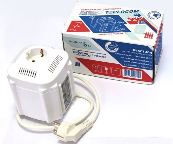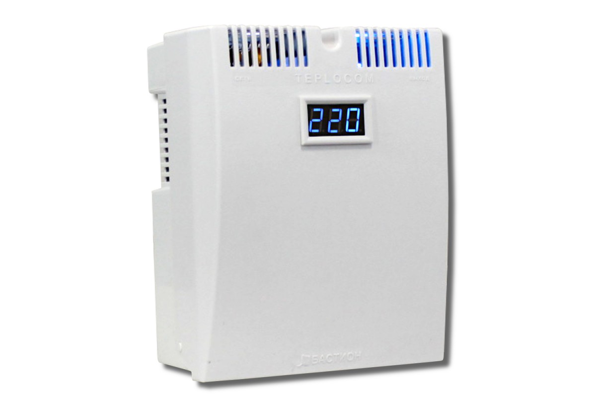 - Bastion Teplocom ST-555. Un autre modèle de type relais, mais dont la puissance est d'un ordre de grandeur inférieur - 280 W, et la tension d'entrée est de 145 ... 260 V. De plus, contrairement à la marque Resant, le temps de réaction de Bastion est de 20 ms, et le nombre de étapes est seulement trois. De plus, l'appareil chauffe pendant le fonctionnement et il n'y a pas de fusible automatique.