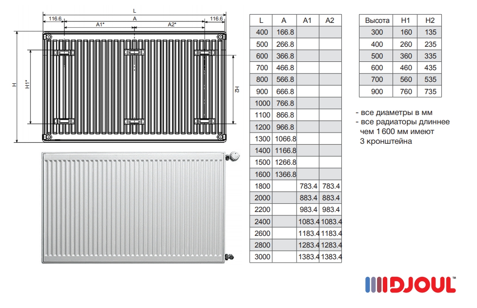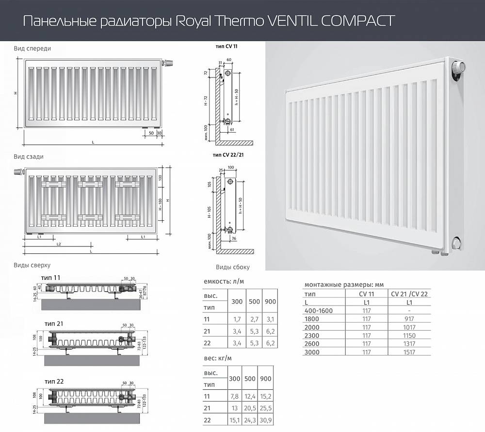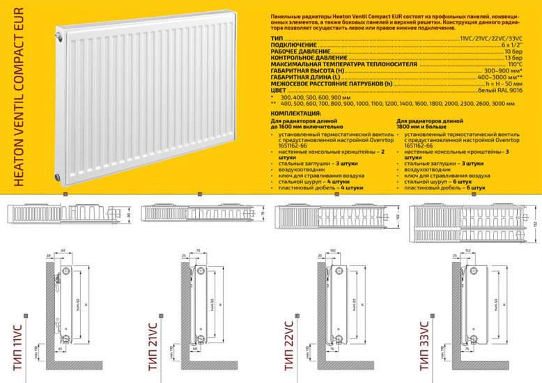 Maintenant, quelques mots peuvent être dits sur les paramètres externes, en particulier sur les dimensions. La longueur des radiateurs à panneaux peut atteindre 3 mètres, leur hauteur est de 20 à 90 centimètres. Un radiateur tubulaire peut avoir presque n'importe quelle longueur et sa profondeur est limitée à 22,5 centimètres. La hauteur varie de 19 à 300 centimètres.