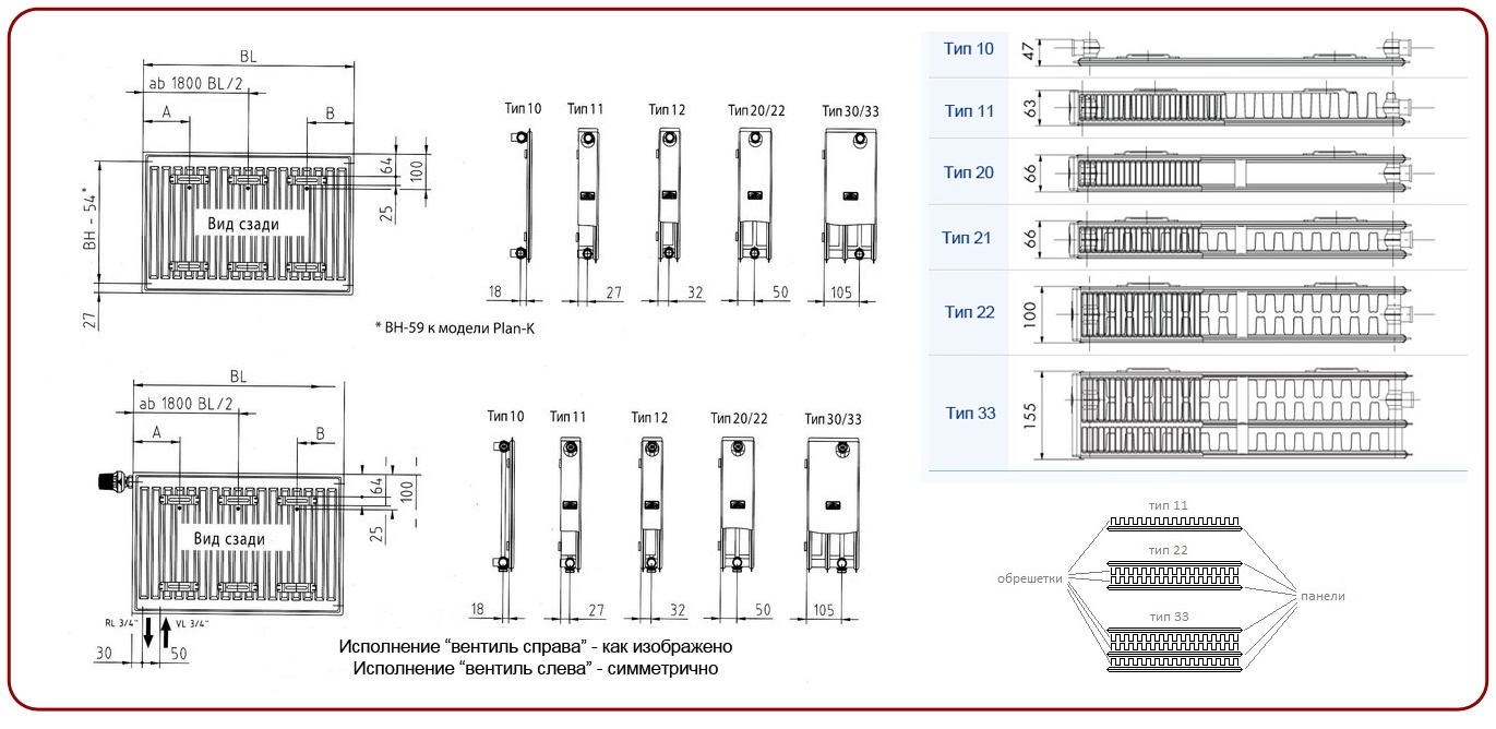 Les radiateurs à panneaux sont la solution la plus économique pour votre propre maison et, par conséquent, sont les plus courants dans les systèmes de chauffage autonomes. En fonction du nombre de panneaux chauffants et d'ailettes de convection, on distingue les types suivants de radiateurs de chauffage à eau de construction à panneaux : 10, 11, 20, 21, 22, 30, 33.