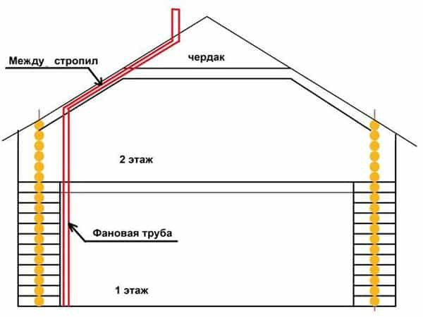 Une telle solution se heurte à l'accumulation de gaz sous le plafond et à leur pénétration dans les locaux de l'étage supérieur. - Il n'est pas souhaitable de monter le tuyau du ventilateur sur un mur extérieur, car cette solution entraînerait des problèmes de formation de condensat.