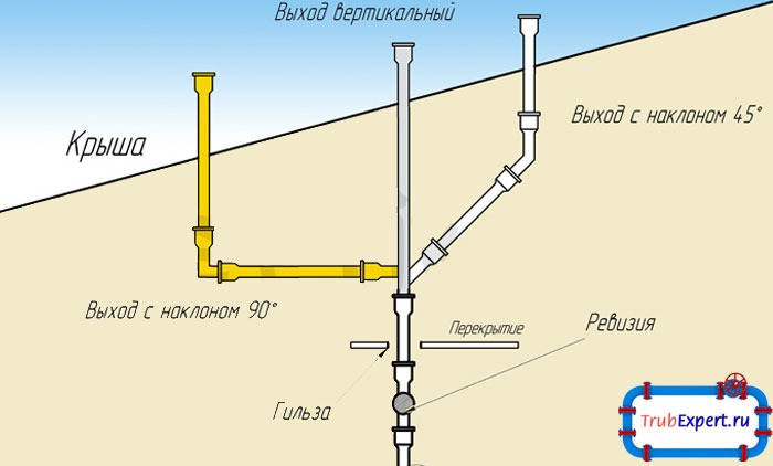 Le tuyau du ventilateur, dans le cadre de la colonne montante, est affiché sur le toit. Sur un toit en pente, il doit dépasser de 0,5 m au-dessus du faîtage, si le toit est utilisé, la distance passe à 3 m.