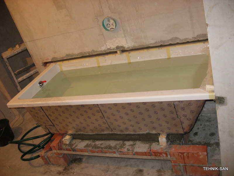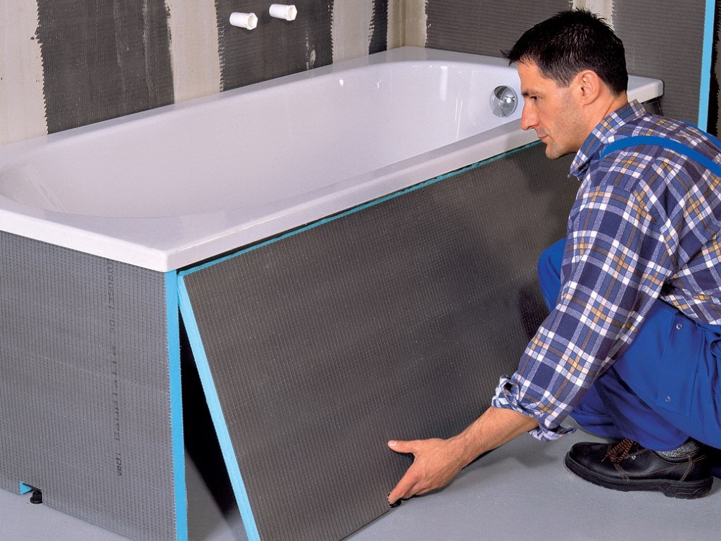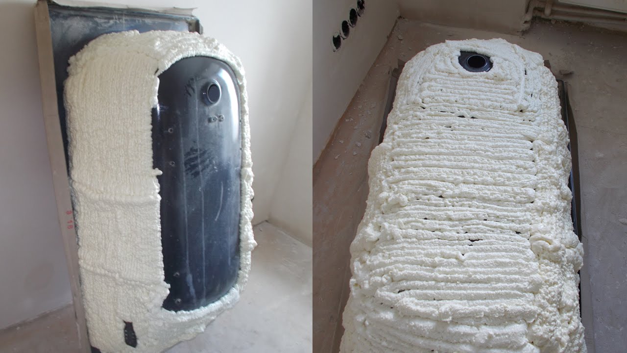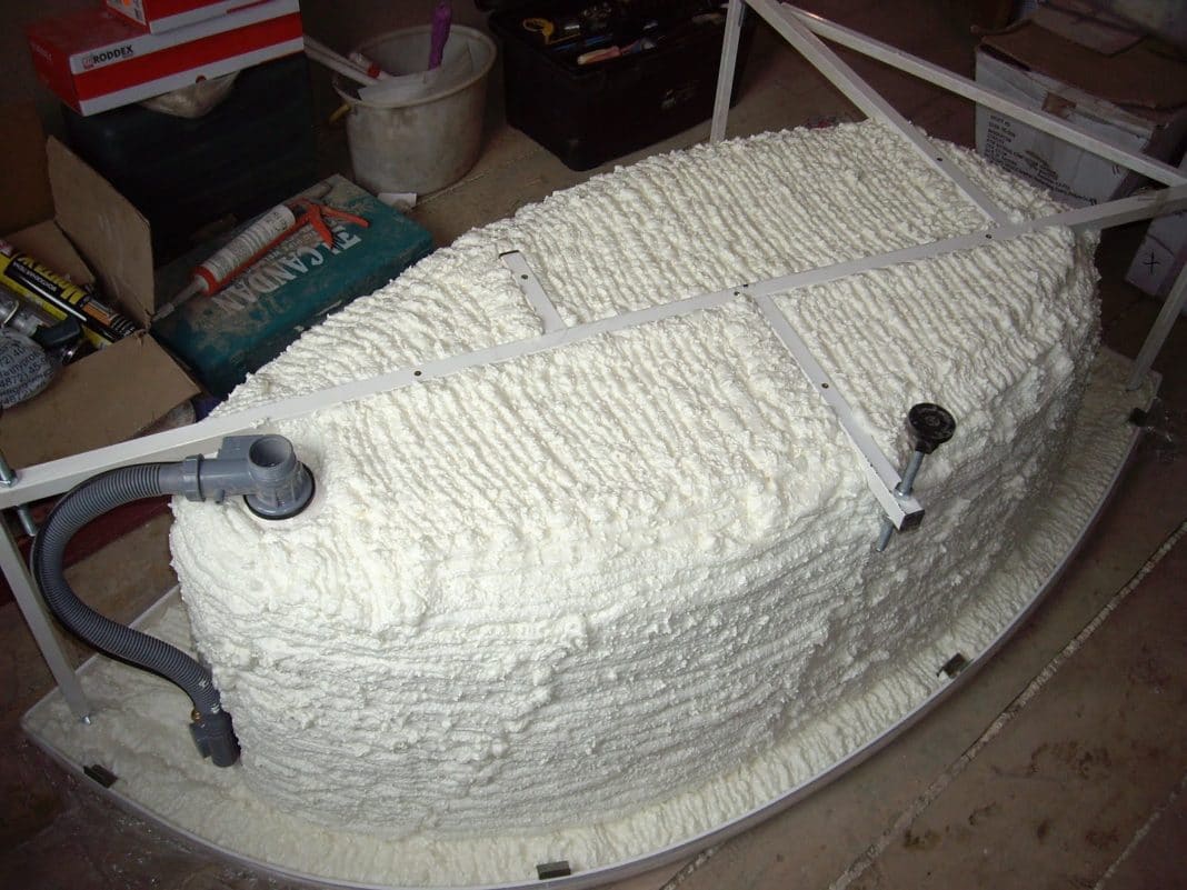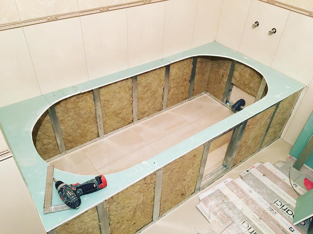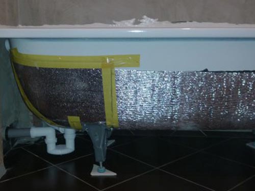 Une couche supplémentaire d'isolant avec un film plastique est réalisée en la pressant contre la mousse non polymérisée. Toute la structure aura l'air imprésentable, donc autour de la baignoire, vous devrez assembler une boîte ou un écran en cloison sèche ou en plastique résistant à l'humidité, et le carreler.