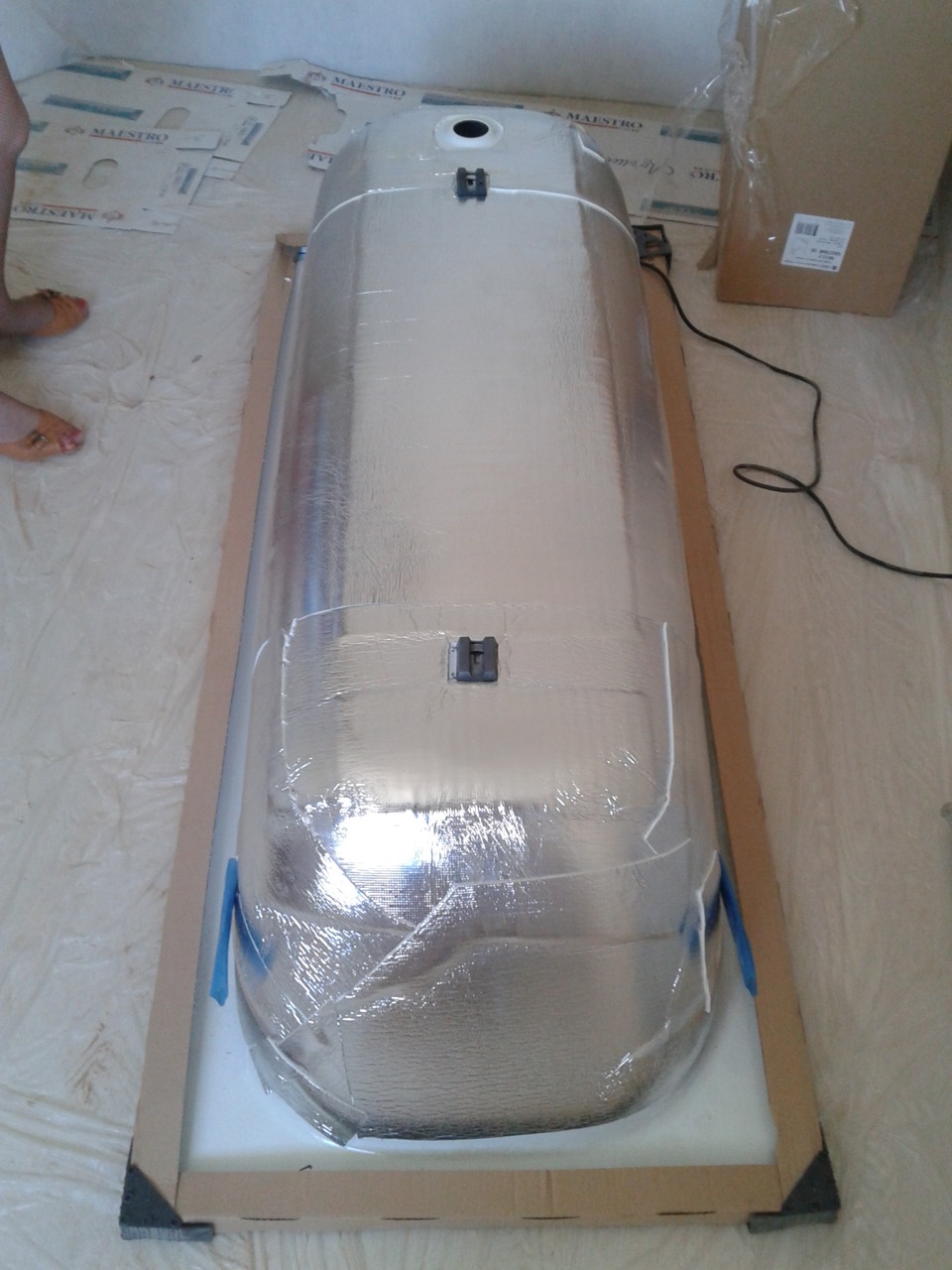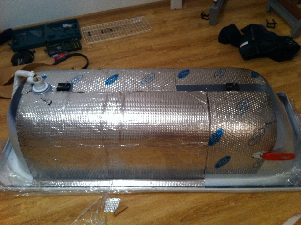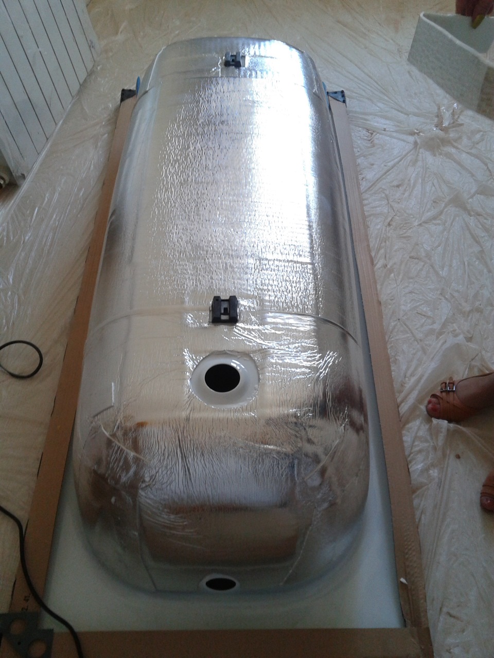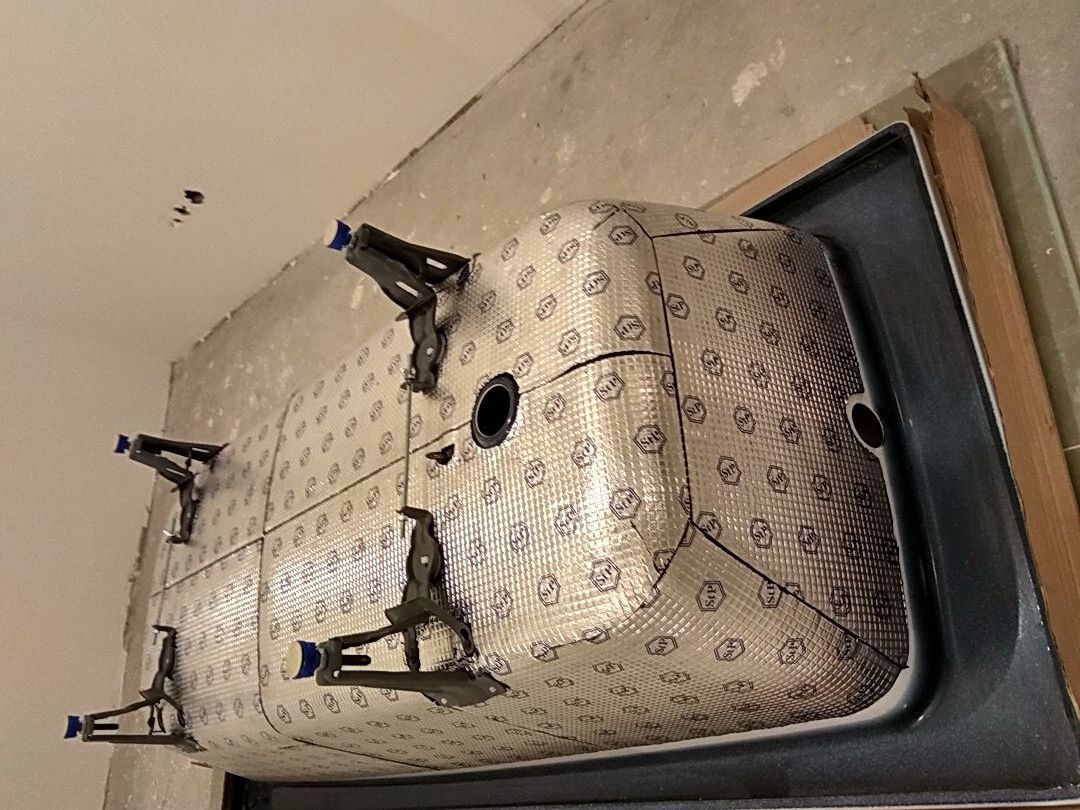 Une couche supplémentaire d'isolant avec un film plastique est réalisée en la pressant contre la mousse non polymérisée. Toute la structure aura l'air imprésentable, donc autour de la baignoire, vous devrez assembler une boîte ou un écran en cloison sèche ou en plastique résistant à l'humidité, et le carreler.