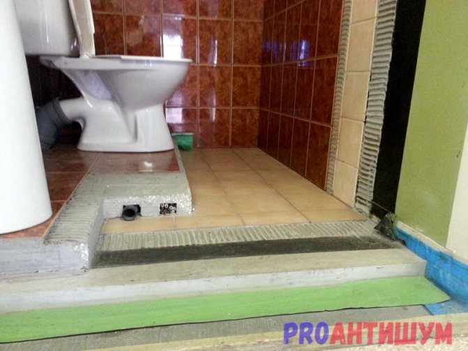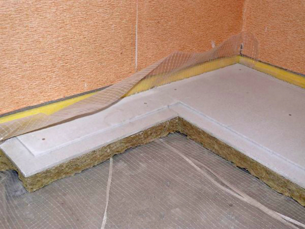 En ce qui concerne le sol, l'épaisseur de la dalle avec chape et revêtement carrelé est suffisante, mais si vous le souhaitez, une barrière supplémentaire peut être installée sous la forme d'un film de membrane résistant à l'humidité, ce qui augmentera la résistance au passage du bruit.