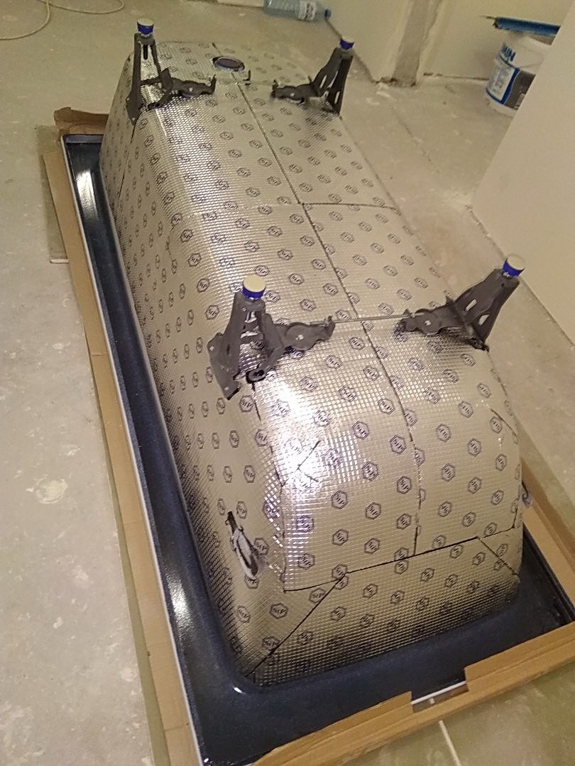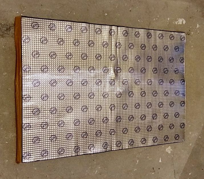 Ce matériau est destiné à l'insonorisation dans une voiture, il est à base de bitume et de caoutchouc. Il est très pratique de fixer des tapis, car ils ont une couche adhésive protégée par un film ou du papier. Nous enlevons le film, le pressons à la surface, le roulons avec un rouleau pour un ajustement parfait, l'isolation est prête. Vous pouvez l'acheter sur les marchés automobiles et dans les magasins de pièces automobiles. Le matériau est assez flexible, il s'adapte donc parfaitement à la surface arrondie de la baignoire.