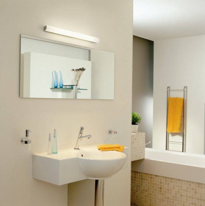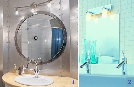 La lampe miroir dans la salle de bain peut être une lampe halogène spectaculaire ou décorée d'une belle bande LED. Il est pratique de choisir une superposition sur le mur avec un virage pour diriger le faisceau de lumière dans la bonne direction.