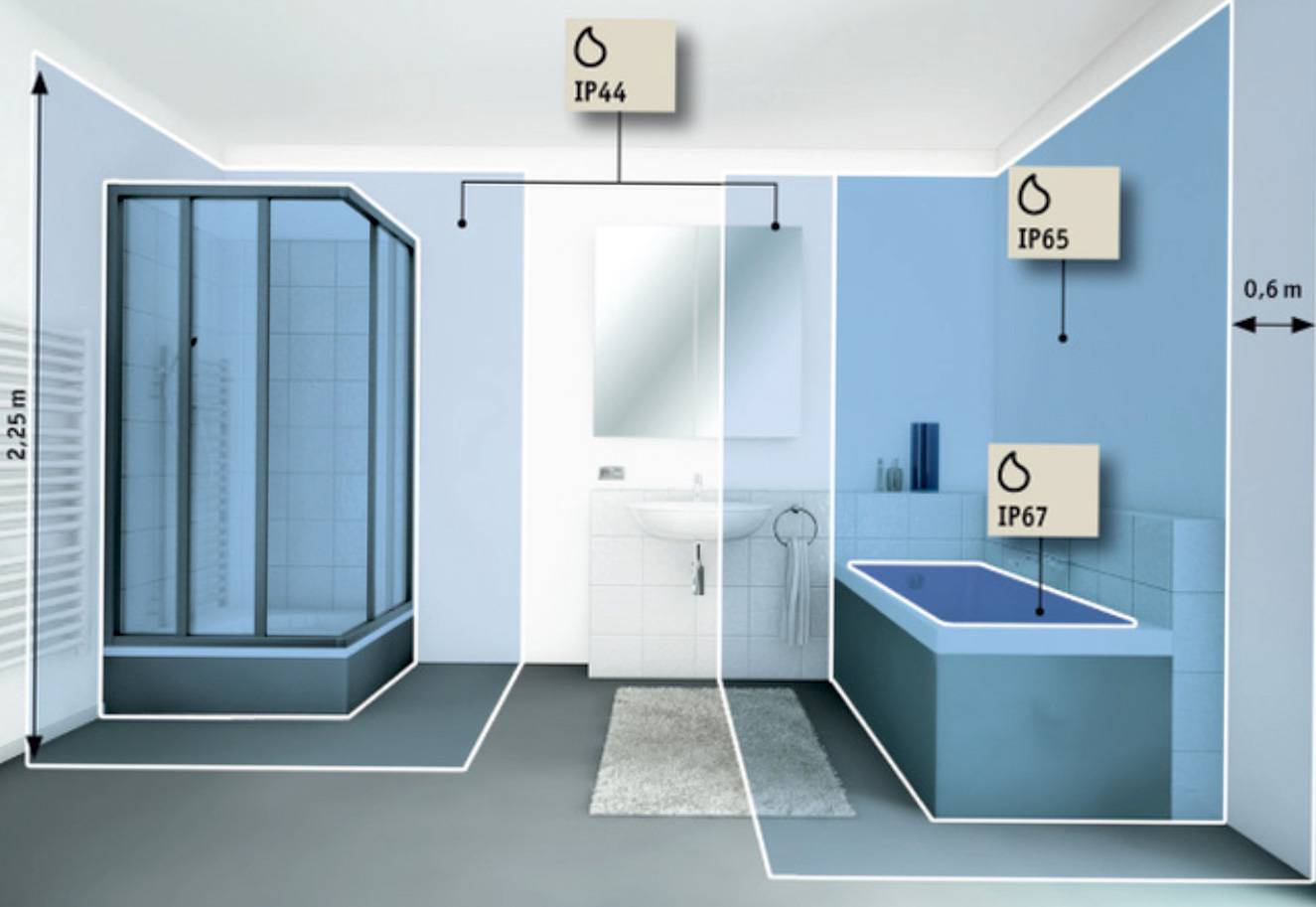 Faites attention à la zone peinte en bleu vif. Il s'agit de la zone la plus dangereuse exposée aux éclaboussures d'eau, c'est pourquoi toutes les sources lumineuses électriques doivent être marquées IP65 - le degré de protection maximal. Voici quelques dispositions qui vous aideront à bien organiser l'éclairage de la salle de bain - pièces à fort taux d'humidité :