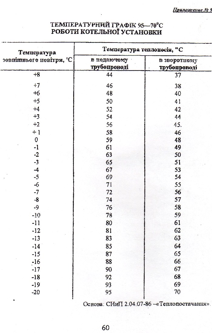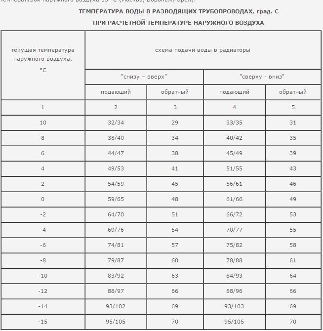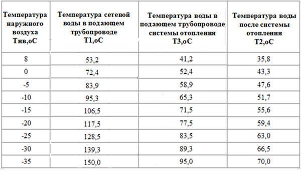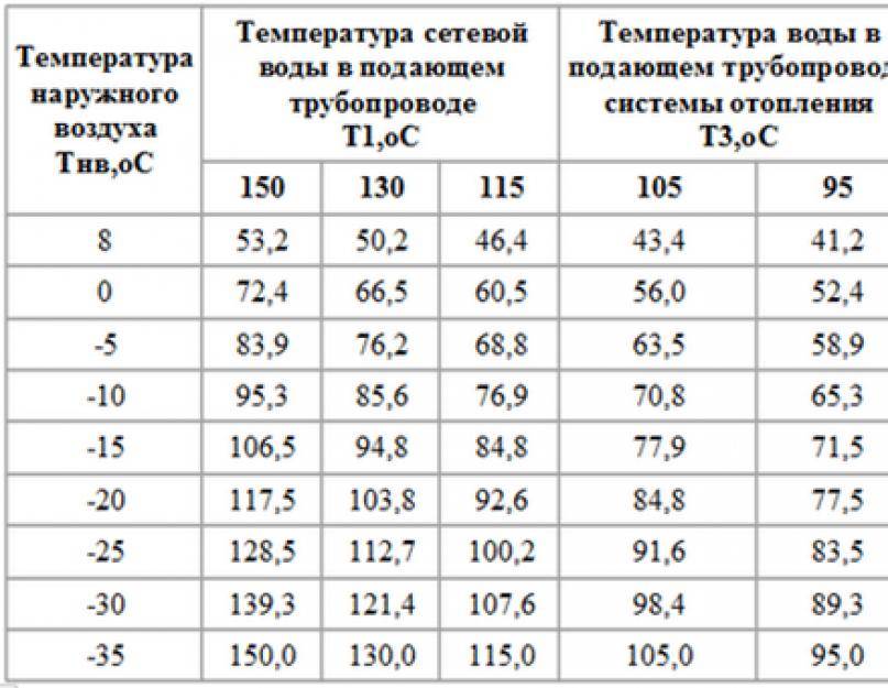 Ces chiffres montrent la température maximale de l'eau d'alimentation et de retour lors des gelées les plus sévères dans une zone particulière. Mais au début et à la fin de la saison de chauffage, lorsque le temps n'est pas encore trop froid, cela n'a aucun sens de chauffer le liquide de refroidissement à 105 ° C, par conséquent, un programme de chauffage à température réelle est établi, qui décrit combien l'eau doit être chauffée à différentes températures extérieures. La dépendance du chauffage aux conditions météorologiques est indiquée dans le tableau, qui contient des extraits du calendrier pour Ufa: