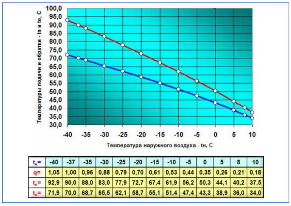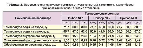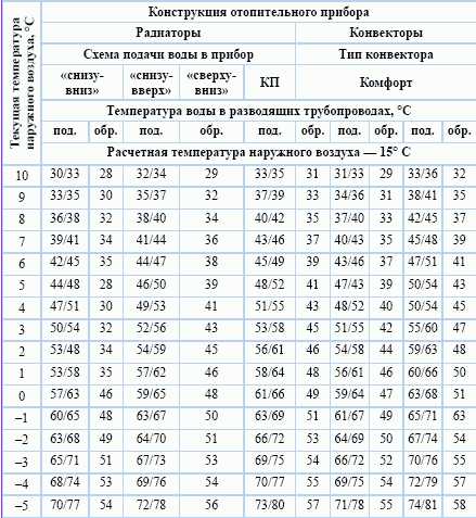 Le schéma optimal d'alimentation en eau des caloporteurs dépend directement de la température à l'extérieur de la fenêtre. Par exemple: lorsqu'il fait -4 ° C à l'extérieur, avec une différence calculée de 105 ° C - 70 ° C et un débit selon le schéma «ascendant», la température de l'eau pour l'alimentation de la batterie doit être de 76 ° C et 54°C pour le retour. Dans les mêmes conditions, mais à 0°C en dehors de la fenêtre de soufflage, le chauffage s'effectue à 65°C, et le retour est à 48°C.