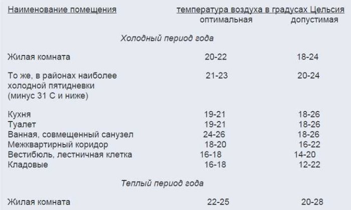 Les normes relatives aux conditions de température sont établies par les SNiP (un ensemble de codes et de réglementations du bâtiment) et sont protégées par la loi. Par conséquent, leurs violations sont administrativement punissables pour les services publics. Liste des normes de base :