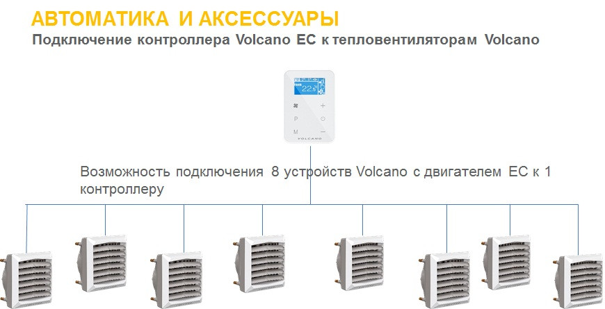Un moteur électrique miniature est chargé de pomper l'air chaud dans les pièces. Il ne consomme que 95 watts d'électricité, tournant à une fréquence de 1450 tr/min. Malgré la puissance minimale, le ventilateur crée un flux d'air horizontal jusqu'à 14 mètres de long ou vertical jusqu'à 8 mètres de long. L'équipement est extrêmement compact - il est conçu pour chauffer de petits espaces. À propos, la puissance thermique des aérothermes Volcano Mini EC est de 3 à 20 kW.