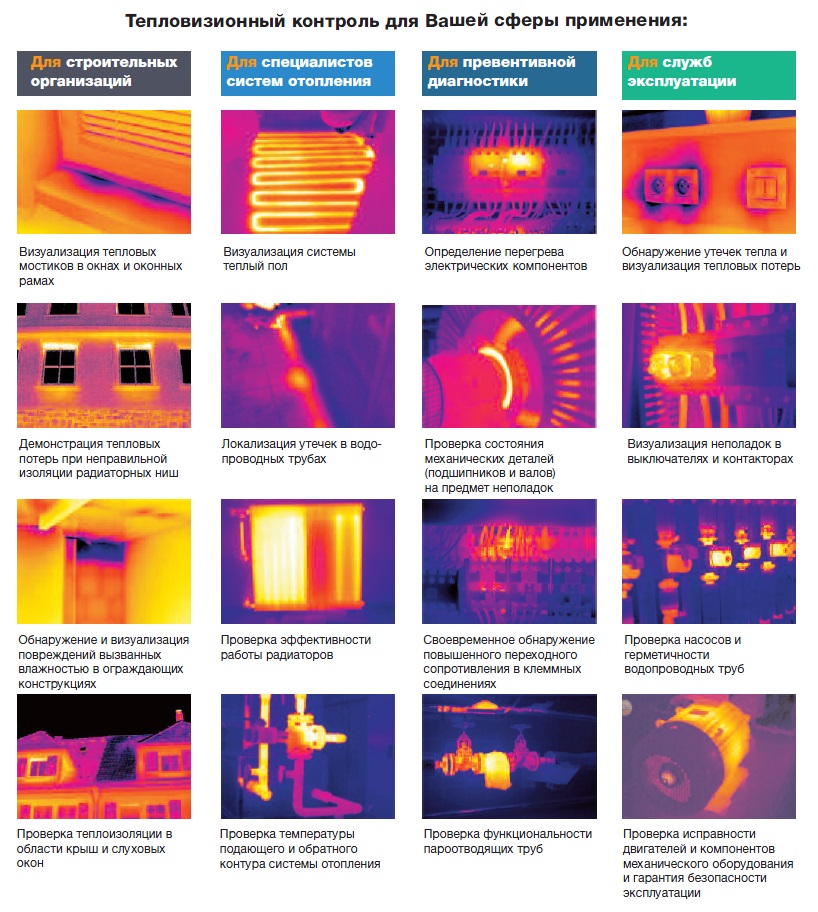 La surface de tous les matériaux et structures a une certaine température. L'uniformité de la température dépend de l'intégrité des surfaces, du type de matériau de base. Lors de l'évaluation de la température de surface, il est possible de déterminer la présence de fissures et de défauts, l'emplacement des réseaux et des tuyaux cachés à l'intérieur des murs, les dommages au câblage électrique et aux systèmes de chauffage. Et ce n'est pas une liste complète des domaines où l'imagerie thermique peut être utilisée.