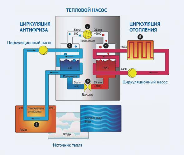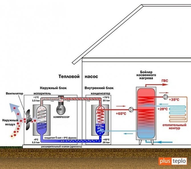 Une pompe à chaleur est un appareil qui ne produit pas de chaleur, mais la déplace d'un endroit à un autre, tout en élevant la température par compression. Ce processus se déroule selon le principe du cycle de Carnot, qui consiste en le mouvement du fluide de travail (réfrigérant) à travers un système fermé. Lorsque son état passe de liquide à gazeux et inversement, une grande quantité d'énergie est libérée ou absorbée. Ce principe est utilisé dans la conception des réfrigérateurs, mais le mécanisme d'action d'une pompe à chaleur consiste à absorber la chaleur de l'extérieur et à la transférer dans la pièce.