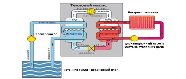 Les pompes à chaleur sont divisées en deux types : à compression et à absorption. L'équipement du premier type est plus populaire, et une telle installation peut être réalisée indépendamment à l'aide d'un compresseur d'un ancien réfrigérateur. Aussi pour la fabrication sera nécessaire un évaporateur, un condenseur et un détendeur.