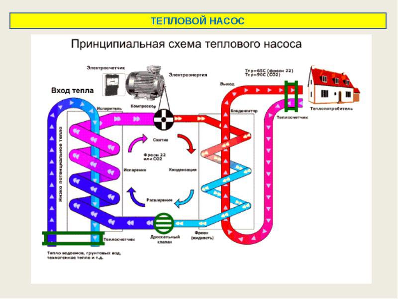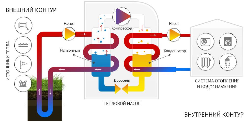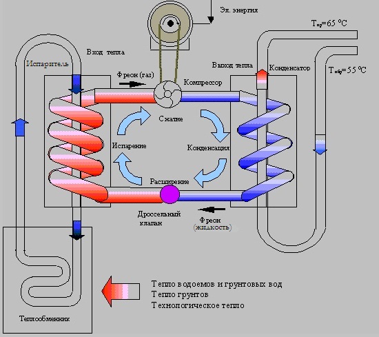Les installations souterraines extraient la chaleur directement du sol à l'aide de turbines ou de collecteurs spéciaux. Dans ce cas, la terre est utilisée comme source, qui chauffe le fréon. Il chauffe l'eau dans le réservoir du condenseur. Dans ce cas, le fréon est refroidi et renvoyé à l'entrée de la pompe, et l'eau chauffée est utilisée comme caloporteur dans le système de chauffage principal.